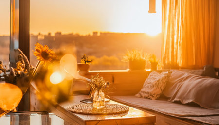 A wooden table featuring a vase of flowers, offering a beautiful view of the sunset through a window overlooking a natural landscape with trees, clouds, and water