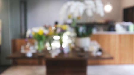 Abstract blur restaurant and coffee shop cafe interior for background. Abstract defocused bokeh in modern restaurant style. Through the window in coffee shop.