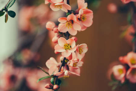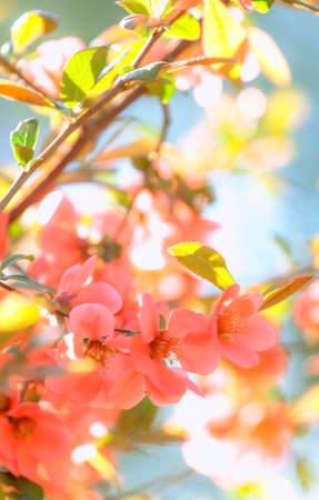Fantastic spring or summer natural pink background with blooming Japanese quince, place for text, blurred image, soft focus.