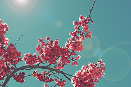 Beautiful cherry blossom sakura in spring time over blue sky.
