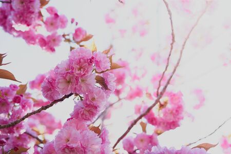 Amazing pink cherry blossoms on the Sakura tree in a blue sky. Beautiful spring tree.