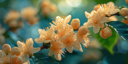 Rose apple tree branch in bloom over natural defocused bokeh background, close up