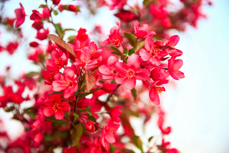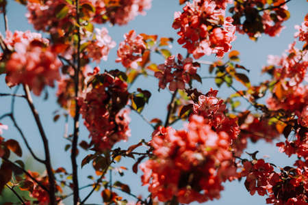 Blooming red flowers closeup. Spring flowering. Blooming tree on blue sky background.