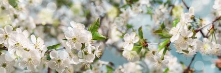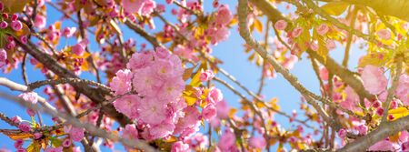Banner 3:1. Cherry blossom in full bloom against blue sky. Spring background. Copy space. Soft focus