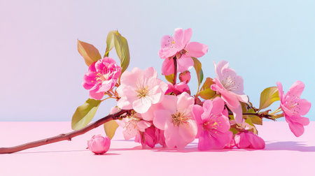 A stunning arrangement of pink blossoms laid gracefully on a pastel pink background, showcasing the delicate beauty of nature in a serene and minimalistic setting.