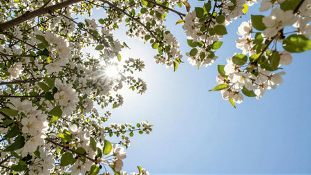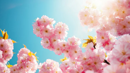 Experience the beauty of blossoming cherry flowers under a radiant blue sky, illuminated by warm sunlight, creating a serene and picturesque spring atmosphere.