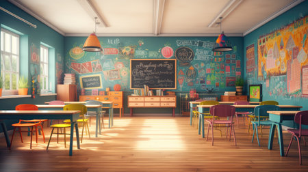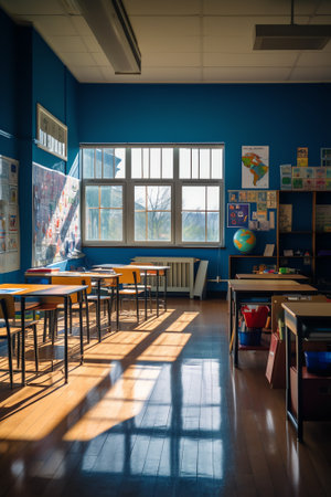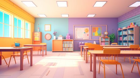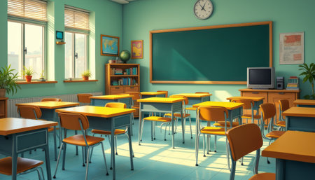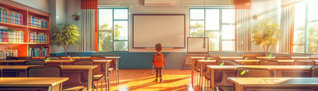 A cheerful classroom bathed in warm sunlight features neatly arranged desks and vibrant orange chairs. The scene evokes a sense of learning and creativity, with educational posters and plants adding a lively touch to the tranquil atmosphere.