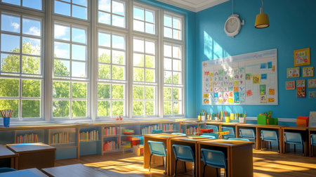 A vibrant classroom features a pastel-colored wall, a blank whiteboard, and neatly arranged desks. Sunlight streams through large windows, creating a warm and welcoming atmosphere perfect for learning and creativity.