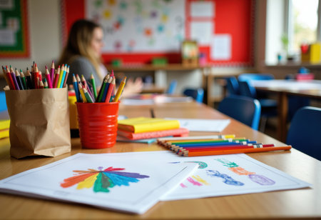 A vibrant classroom scene featuring an array of art supplies, including colored pencils and crayons, scattered across a wooden table. Drawings in various colors showcase creativity, while a student is engaged in the background