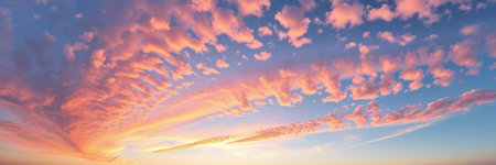 A breathtaking view of a sunset sky filled with soft clouds and vibrant colors, capturing the tranquil beauty of nature during twilight hours.