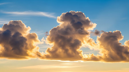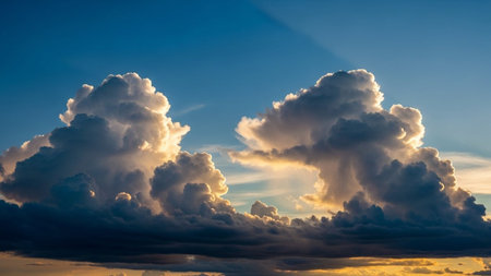 Towering cumulus clouds catch the golden light of sunset, casting dramatic shadows against a deep blue sky with...