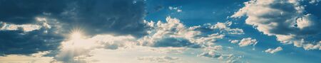 Bright blue sky background, lighted clouds. Nature composition. Panoramic sunset scenery, sparkle sun and clouded sky.
