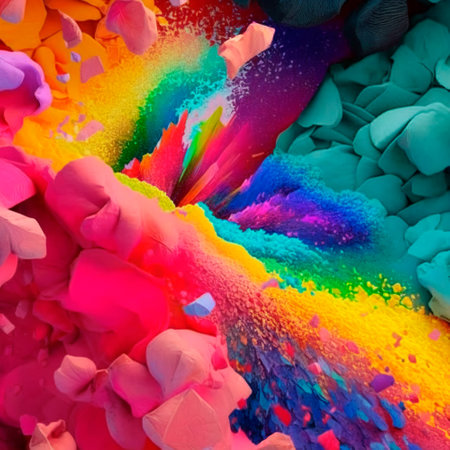 A vibrant and dynamic display of rainbow colors splattered across a canvas, creating an explosion of energy and joy. The paint splashes and blobs form abstract shapes and patterns, capturing the essence of creativity and artistic expression.