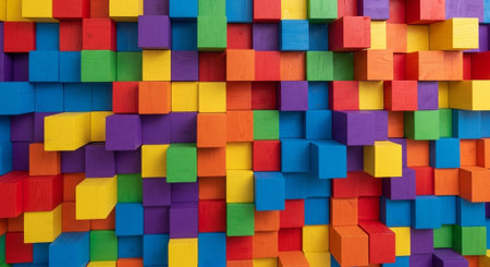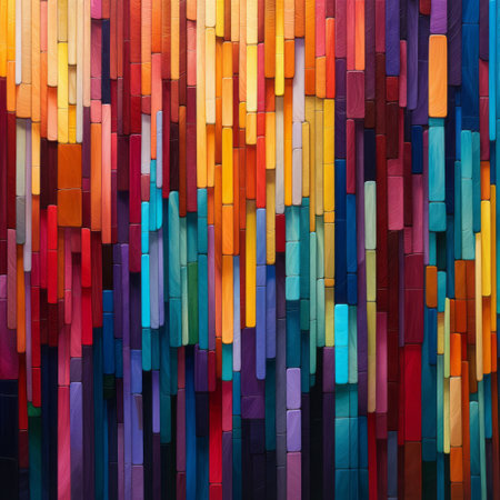 A lively mosaic of wooden pieces in bold hues, creating an energetic and eye-catching display perfect for playful or creative themes.