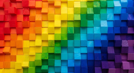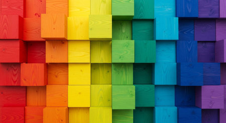 rainbow wooden squares made of different colored blocks.