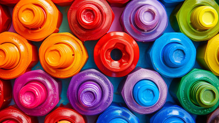 A topdown view of a collection of brightly colored wheel nuts arranged in a vibrant and playful rainbow of hues