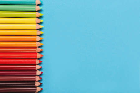 a row of colored pencils with different colors against light blue background, pencils on the right side with copy space