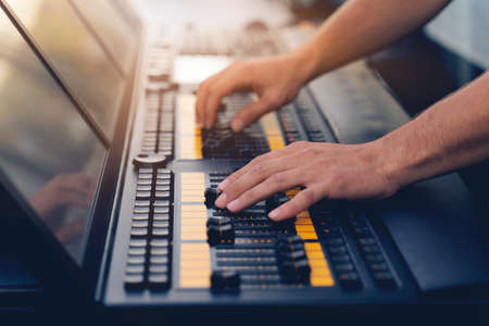 Hands of a sound engineer operating a digital mixing console with various buttons and glowing screens.
