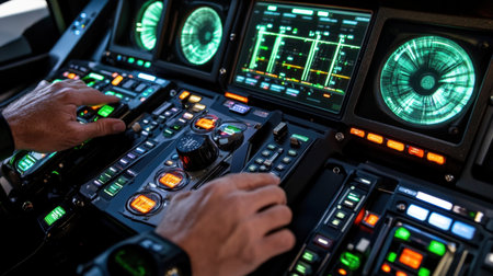 A panel filled with tactile buttons and a touchscreen where an operator manages various IoT devices demonstrating the intuitive control facilitated by enhanced 5G network capabilities