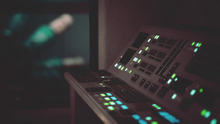 A vibrant control panel is filled with glowing buttons and switches in a dimly lit studio. In the background, a blurred figure engages with the equipment, capturing a moment of creativity and focus.