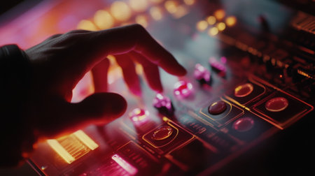 Sound engineer adjusting levels on innovative digital audio mixer in music production studio