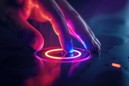 A hand reaches towards a vintage control knob, illuminated by colorful lights, as the surrounding atmosphere hints at an old electronic device in use.
