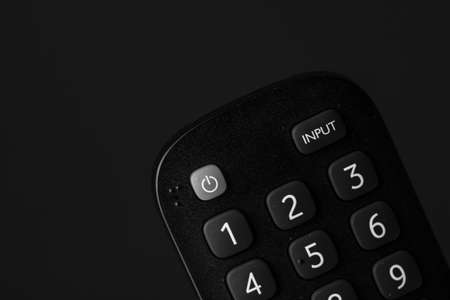 Selective focus, details of TV remote control buttons. Bucharest, Romania, 2021.