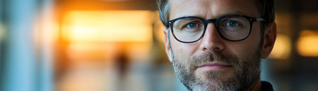 Confident businessman with glasses, blurred background of a modern office, soft light, medium closeup