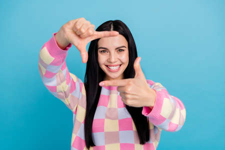 Photo of excited funky lady dressed print pullover showing photo gesture isolated blue color background