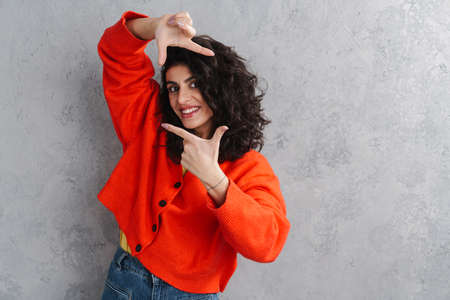 Happy beautiful brunette girl smiling and showing photo frame gesture isolated over grey wall