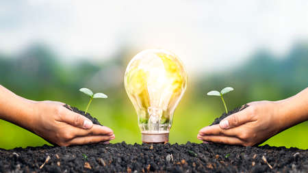 The hand that emerged from the ground, including a small tree growing in an energy-saving light bulb, an energy saving and environmental protection concept.