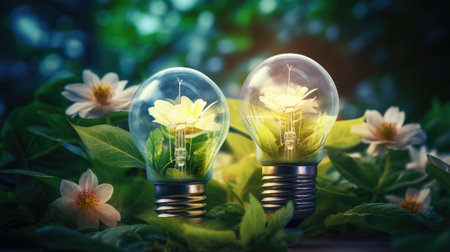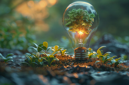 A light bulb with a green plant inside illuminates brightly against a backdrop of lush foliage, symbolizing the promise of clean and renewable energy.