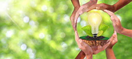 Trees growing in people's hands and energy-saving light bulbs that illuminate the ground, green energy alternative concept.