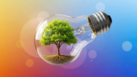 Light bulb with tree inside against a blurred nature background, eco-friendly concept