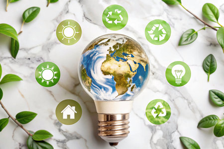 Earth in sustainable lightbulb, marble surface, green leaves, icons