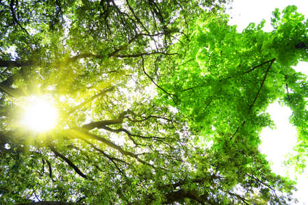 Beautiful Nature Blurred Background. Green Bokeh. Summer or spring backdrop with fresh green leaves and sun flares