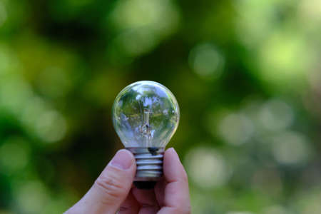 The human hand that holds a light bulb for an idea or achievement consists of a natural green background, the concept of success and solar energy.