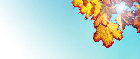 Colorful autumn leaves over sunny sky background