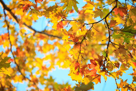 Orange maple leaves on the tree, blue sky, autumn natural background, selective focus