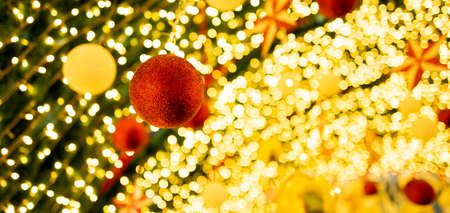 Greeting Season concept.close up of ornaments on a Christmas tree with decorative light