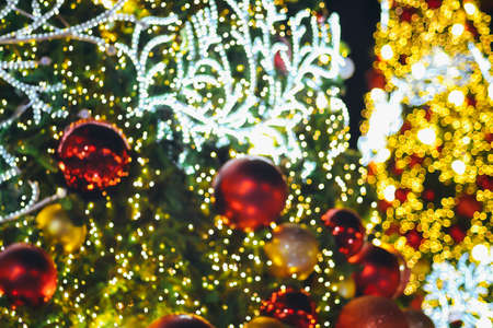 Closeup of Festively Decorated Outdoor Christmas tree with bright balls on blurred background.