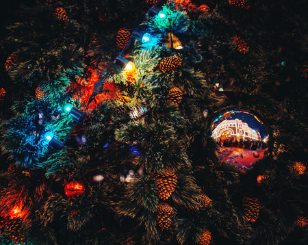 Christmas and New Year background. Festive decorations on the background of a Christmas tree.