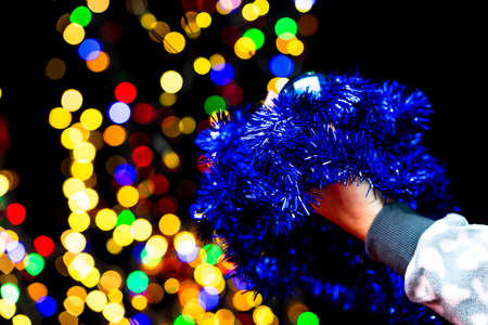 electric garland for decorating a Christmas tree, close-up. outdoor christmas tree decoration. glowing garland on christmas tree