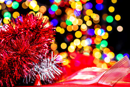 Christmas and New Year Decoration. Baubles hanging on Christmas Tree. Xmas holiday background with garlands, tinsel, ball.Christmas tree with defocused blurred lights bokeh