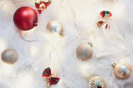 Christmas and New Year holidays background, winter season. Christmas greeting card with ornaments and lights for tree.