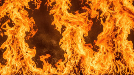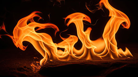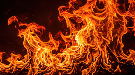 An intense fire blazes against a dark backdrop. The flames exhibit vibrant shades of orange and red, with a textured appearance suggesting movement and energy. The composition presents a close-up view, allowing focus on the details of the combustion. This image could be suitable for illustrating concepts of heat, energy, or power.