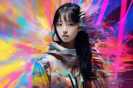 Cyberpunk style portrait of beautiful young woman in futuristic costume. Image with glitch effect.