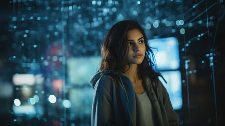Metaverse digital Avatar, Metaverse Presence, digital technology, cyber world, virtual reality, futuristic lifestyle. Woman in augmented reality, game with neon blur lines