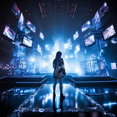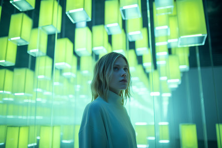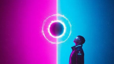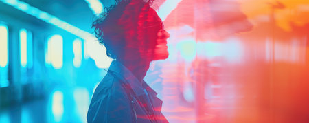 Man Immersed in Vibrant Neon Lights with Digital Reflections.
