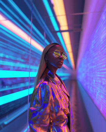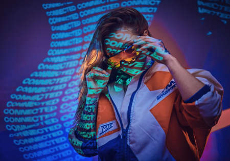 Young charismatic female standing in neon studio, in front of text projection, wearing bright blazer and holographic sunglasses. Cyberpunk concept